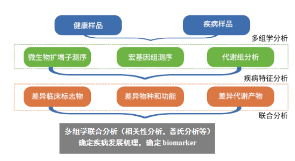 ?微生物組測序(主要指擴增子測序與宏基因組測序)可提供微生物組成、基因功能和豐度信息,而代謝組學(xué)是研究生物體中代謝產(chǎn)物變化的科學(xué)。生物科學(xué)研究過程復(fù)雜,單—組學(xué)往往無法全面的解決生物學(xué)問題,多組學(xué)就顯得尤為重要。近年來,隨著微生物組學(xué)研究的不斷發(fā)展和持續(xù)火熱,越來越多的研究者開始將微生物組學(xué)和代謝組學(xué)聯(lián)合起來,從物種、基因以及代謝產(chǎn)物等水平共同解釋科學(xué)問題,更好地理解疾病過程及機體內(nèi)物質(zhì)的代謝途徑,還有助于發(fā)現(xiàn)疾病的生物標記以更進—步應(yīng)用千臨床輔助診斷。