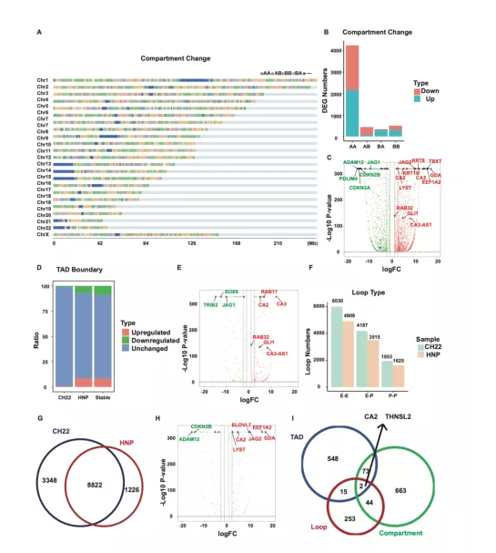 在腫瘤發(fā)生過程中,染色質(zhì)compartments會(huì)進(jìn)行轉(zhuǎn)換。與HNP相比,CH22的每條染色體中都發(fā)現(xiàn)了compartments轉(zhuǎn)換,尤其是在chr1、9、13-16和22(圖3A)。HNP中9.99%的compartments A在CH22中為compartments B,6.06%的compartments B在CH22中為compartments A,從A到B的轉(zhuǎn)換中基因的表達(dá)顯著下調(diào)(p=1.08 e-74 ),反之亦然(p=4.11 e- 47 )。