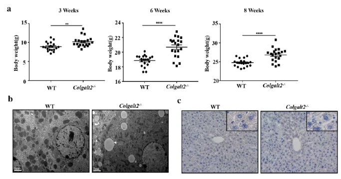 通過肝組織的PCR和western blotting,結(jié)果顯示Colgalt2?/?小鼠中不表達(dá)COLGALT2。在3,6,8周齡時(shí)分別對Colgalt2?/?和WT小鼠稱重,結(jié)果顯示Colgalt2敲除增加了小鼠的體重(圖1a)。通過透射電鏡觀察發(fā)現(xiàn),6周齡Colgalt2?/?小鼠肝細(xì)胞中有脂滴聚集(圖1b)。然而,在6-8 周齡時(shí),WT小鼠和Colgalt2?/?小鼠的肝油紅O染色和TG含量沒有明顯差異(圖1c)。
