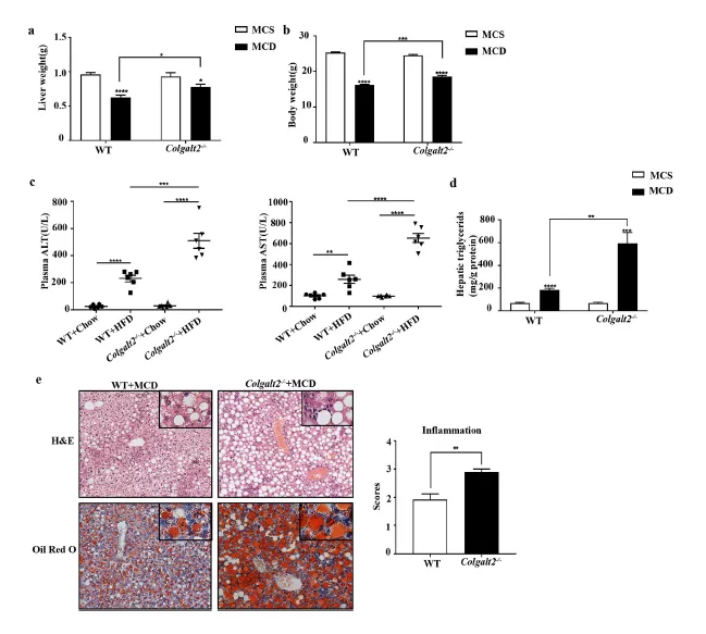NASH是NAFLD疾病進(jìn)展階段。為了研究 Colgalt2對MCD誘導(dǎo)的脂肪性肝炎的影響,WT和Colgalt2?/?小鼠連續(xù)喂食MCD飲食3周。與WT小鼠相比,Colgalt2?/?小鼠的體重和肝臟重量增加(圖3a和b)。在MCD喂養(yǎng)的小鼠中,Colgalt2?/?小鼠的ALT和AST血漿水平及AST均顯著升高(圖3 c)。H&E和油紅O染色顯示,MCD喂養(yǎng)的Colgalt2?/?小鼠的肝臟脂肪變性和炎癥浸潤比WT小鼠更嚴(yán)重(圖3e)。與此同時(shí),與WT小鼠相比,MCD喂養(yǎng)的Colgalt2?/?小鼠肝臟TG含量顯著增加(圖3d)。在MCD飲食組中,Colgalt2?/?小鼠的炎癥評分明顯高于WT小鼠(圖3e)。