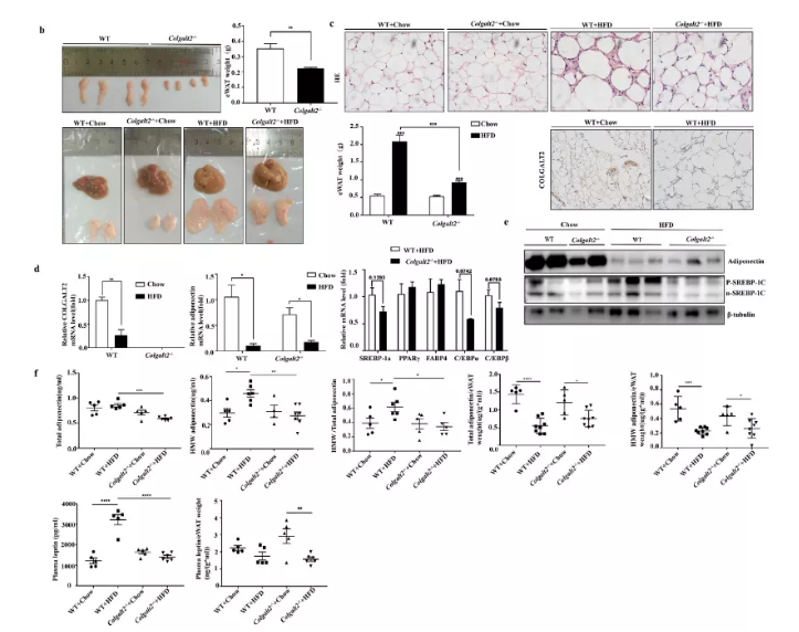脂聯(lián)素對肝細(xì)胞有重要的抗脂肪變性作用。因此,為了檢測Colgalt2對脂聯(lián)素的影響,作者研究了脂聯(lián)素在白色脂肪組織WAT中的表達(dá)、血漿總脂聯(lián)素和HMW脂聯(lián)素水平。出人意料的是,在Colgalt2缺陷的小鼠中觀察到部分脂肪營養(yǎng)不良。與WT小鼠相比,Colgalt2?/?小鼠(6周齡)的eWAT體重降低(圖4b)。此外,在HFD喂養(yǎng)16周后,Colgalt2敲除抑制小鼠的脂肪組織擴(kuò)張,而在WT小鼠脂肪組織明顯體積增大(圖4b)。脂肪形成由復(fù)雜的轉(zhuǎn)錄因子網(wǎng)絡(luò)(C/EBP家族成員,PPARγ,SREBP-1c等) 控制,這些因子在脂聯(lián)素基因表達(dá)、代謝和其他脂肪特異性基因中發(fā)揮重要作用。在HFD喂養(yǎng)的Colgalt2?/?小鼠中,C/EBPα、C/EBPβ和脂肪生成標(biāo)記物SREBP1a有降低趨勢(圖4d)。此外,在HFD喂養(yǎng)的Colgalt2?/?小鼠中,p-SREBP-1c和n-SREBP- 1c蛋白表達(dá)明顯下調(diào)(圖4e)。