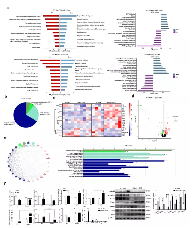 為了探索NAFLD中Colgalt2缺乏的潛在機(jī)制,作者對WT小鼠和飼喂HFD或標(biāo)準(zhǔn)飼料的Colgalt2?/?小鼠肝組織進(jìn)行ONT全長轉(zhuǎn)錄組測序。結(jié)果顯示,與WT小鼠相比,HFD喂養(yǎng)的Colgalt2?/?小鼠中有321個(gè)DEGs。為了明確DEGs的功能,分別對上調(diào)和下調(diào)的 DEGs進(jìn)行KEGG通路富集分析(P < 0.05) (圖5a)。對于上調(diào)的基因,KEGG分析顯示這些差異表達(dá)基因顯著富集于MAPK信號通路、NAFLD、和氧化磷酸化。下調(diào)的基因富集于脂肪消化和吸收、甘油脂代謝。在這些途徑中,19個(gè)差異表達(dá)基因與脂代謝密切相關(guān),包括adipoR1、adipoR2和脂質(zhì)合成相關(guān)的分子,包括Cidea和Cidec (FSP27)、Cd36和PPARγ(圖5c)。為了進(jìn)一步研究這19個(gè)基因在這些通路中的作用,使用ClueGO和CluePedia工具解讀這些通路網(wǎng)絡(luò)(圖5 d)。這些基因在AMPK信號通路、脂肪細(xì)胞因子信號通路和NAFLD等中富集(圖5 b和e)。