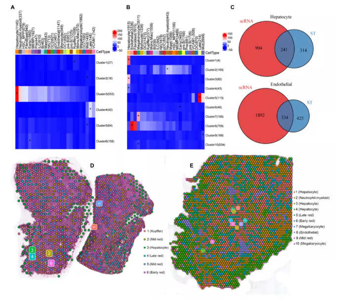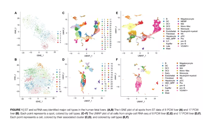 為了研究胎兒肝臟中免疫細(xì)胞和紅細(xì)胞的發(fā)育,作者利用ST技術(shù)分析了人類(lèi)肝臟發(fā)育過(guò)程中基因表達(dá)的時(shí)空動(dòng)態(tài)。在篩選數(shù)據(jù)后,在8周PCW肝臟中檢測(cè)到1267個(gè)高質(zhì)量spots,平均每個(gè)spot包含204,628條reads,檢測(cè)到1,132個(gè)基因和5,924個(gè)UMIs。在17周PCW中,肝臟由3,489個(gè)單獨(dú)spots組成,平均78,576條reads,8,829個(gè)UMI,過(guò)濾后每個(gè)點(diǎn)檢測(cè)到2,266個(gè)基因。通過(guò)對(duì)每個(gè)ST陣列的spots進(jìn)行降維和聚類(lèi),根據(jù)基因表達(dá)模式在8周PCW肝臟(圖1A)和17周PCW肝臟(圖1B)中確定了6個(gè)和10個(gè)主要cluster。由于ST缺乏細(xì)胞分辨率,作者利用scRNA-seq技術(shù)研究了8周PCW和17周PCW活組織的基因表達(dá)異質(zhì)性。在應(yīng)用質(zhì)量控制過(guò)濾器和標(biāo)準(zhǔn)化后,scRNA序列數(shù)據(jù)分別25,186個(gè)細(xì)胞和9,153個(gè)細(xì)胞組成,每個(gè)細(xì)胞中有2,454和2,705個(gè)獨(dú)特表達(dá)的基因。為了探索活體器官的細(xì)胞組成,作者處理了單細(xì)胞數(shù)據(jù),并在8和17周PCW肝臟中鑒定了31和25種細(xì)胞狀態(tài),每種狀態(tài)都根據(jù)文獻(xiàn)中已知的標(biāo)記基因進(jìn)行了注釋?zhuān)▓D1C-F)。作者將這些cluster鑒定為B細(xì)胞、樹(shù)突狀細(xì)胞(DC)、DC1、DC2、早期成紅細(xì)胞、內(nèi)皮細(xì)胞、HSC_MPP、成纖維細(xì)胞、肝細(xì)胞、kuper、ILC、晚期成紅細(xì)胞、MEMP、肥大細(xì)胞、巨核細(xì)胞、中成紅細(xì)胞、單核細(xì)胞、中性粒細(xì)胞、NK、pDC、Pre、Pre-B、Pro-B和VCAM1+。