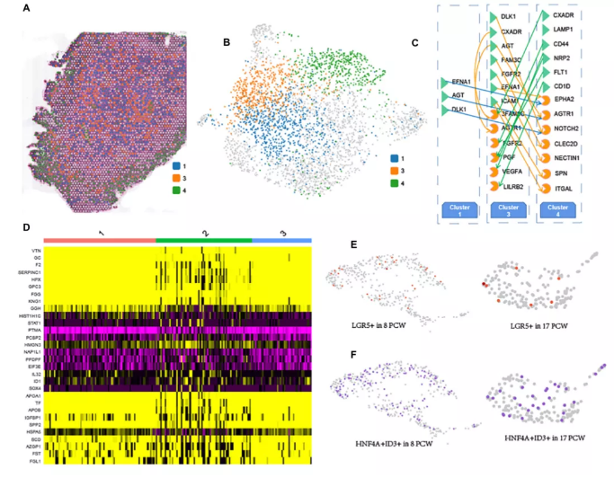 如圖3E所示,肝細(xì)胞是17 PCW肝臟的主要實(shí)質(zhì)細(xì)胞。作者觀察到三個(gè)不同的肝細(xì)胞cluster(cluster1、3和4)沿著17周PCW肝臟的空間深度分布(圖4A、B)。作者發(fā)現(xiàn)MEG3、ITIH3和HMGCS1呈cluster1高表達(dá)。FGB、IGFBP1和A2M基因在cluster3中表達(dá)更高,表明區(qū)域DEGs可能參與了相應(yīng)區(qū)域特異性功能的形成。此外,cluster4組中的肝細(xì)胞高表達(dá)數(shù)個(gè)基因,包括MT-CO1、MT-CO2、MT-CO3,它們參與線粒體電子傳遞和氧化磷酸化。值得注意的是,cluster1和3主要聚集在肝組織的中心區(qū)域,cluster4主要聚集在肝的周?chē)鷧^(qū)域(圖4a)。差異表達(dá)分析的熱圖顯示肝細(xì)胞分化過(guò)程中逐漸下調(diào)或上調(diào)的基因。GO分析表明,1-3-4cluster中逐漸上調(diào)的基因主要與細(xì)胞極性通路、Wnt信號(hào)通路和GTPase活性的調(diào)節(jié)有關(guān),而逐漸下調(diào)的基因則參與壞死細(xì)胞死亡、糖原生物合成過(guò)程的調(diào)節(jié),肝臟再生。此外,作者描述了cluster1-3-4細(xì)胞之間的細(xì)胞通訊(圖4C),為將來(lái)的研究提供了潛在的信號(hào)轉(zhuǎn)導(dǎo)信息。值得注意的是,盡管cluster3和cluster1的距離更近,但cluster3與cluster4細(xì)胞的信號(hào)轉(zhuǎn)導(dǎo)比cluster1細(xì)胞更為顯著。此外,作者還發(fā)現(xiàn)了一些共享的和活躍的配體-受體對(duì),如DLK1-NOTCH2、EFNA1EPHA2、AGT-AGTR1,這些配體-受體對(duì)既存在于cluster1細(xì)胞與cluster4細(xì)胞的細(xì)胞通訊中,也存在于cluster3細(xì)胞與cluster4細(xì)胞的細(xì)胞通訊中。