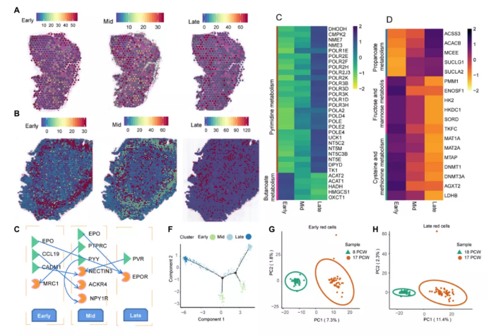 在8PCW肝臟中,小的紅細(xì)胞簇散布在整個(gè)肝臟中(圖5A)。在17PCW肝臟中,肝臟充滿了紅細(xì)胞,并且完全變紅(圖5b)。值得注意的是,早期的紅細(xì)胞位于肝組織的外圍,而中期紅細(xì)胞和晚期紅細(xì)胞則分散在肝組織的中心區(qū)域(圖5B)。這一戲劇性的形態(tài)學(xué)變化表明,在實(shí)驗(yàn)研究期間,人類(lèi)胎兒肝臟都經(jīng)歷了血液的快速生長(zhǎng)和遷移。在8和17PCW肝中均有早、中、晚期成紅細(xì)胞。為了研究紅細(xì)胞的發(fā)育過(guò)程,作者研究了這三種類(lèi)型紅細(xì)胞間差異表達(dá)的基因。在8PCW肝臟中,818個(gè)基因在早、晚分化過(guò)程中逐漸下調(diào),2648個(gè)基因在早、晚分化過(guò)程中逐漸上調(diào)。逐漸上調(diào)的基因富含乙醛酸和二羧酸代謝、嘧啶代謝、果糖和甘露糖代謝、丙酮酸代謝和嘌呤代謝,而逐漸下調(diào)的基因與丁酸代謝相關(guān)(圖5C)。在17PCW肝組織中,有812個(gè)基因在分化早期、中晚期逐漸下調(diào),880個(gè)基因在分化早期、中晚期逐漸上調(diào)。