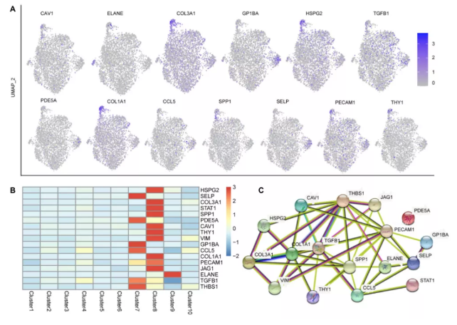 為了進(jìn)一步揭示這一現(xiàn)象,作者分析了這17種肝病相關(guān)基因在17PCW胚胎腎臟中的表達(dá)水平。除PECAM1外,其余基因在17PCW腎中表達(dá)。但其表達(dá)模式與肝臟不同,主要不在巨核細(xì)胞和內(nèi)皮細(xì)胞中表達(dá),說(shuō)明這些肝病相關(guān)基因在胚胎肝臟中具有獨(dú)特的基因表達(dá)模式。此外,對(duì)這17個(gè)肝病相關(guān)基因的蛋白質(zhì)相互作用網(wǎng)絡(luò)分析顯示TGFB1、COL1A1、SPP1、PECAM1和THBS1在表達(dá)網(wǎng)絡(luò)中起關(guān)鍵作用,而PDE5A與其他基因沒(méi)有相互作用(圖6C)。