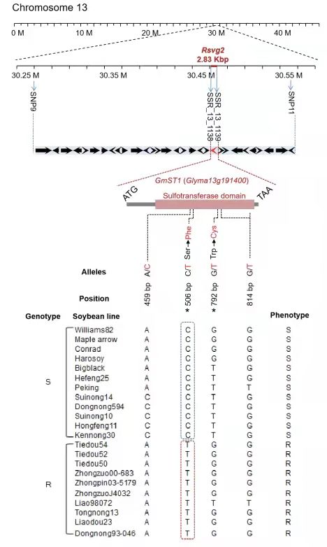 大豆[Glycine max(L.)Merr。]是一種在世界范圍內(nèi)種植的重要油料作物,是人類豐富的植物油和蛋白質(zhì)來源。但許多病原體優(yōu)先攻擊大豆。這些攻擊導(dǎo)致嚴重的產(chǎn)量損失和質(zhì)量下降。在全世界攻擊大豆的病原體中,大豆花葉病毒(SMV)是通過蚜蟲和感染的種子非持久性傳播的,是最廣泛和破壞性最大的疾病之一。SMV感染通常會使大豆產(chǎn)量降低10–30%,但在嚴重暴發(fā)時,損失可能達到50–100%。根據(jù)大豆品種中SMV感染的癥狀,包括典型的葉片圖案,葉片變形,植物發(fā)育不良,頂部壞死和種子斑點,將SMV菌株分為7種主要致病型:G1-G7。由于種子的可傳播性,所有主要大豆生產(chǎn)國都存在菌株致病型(G1-G7)。目前,有4個主要的SMV抗性基因座(Rsv1,Rsv3,Rsv4和Rsv5),大豆基因組的可用性加快了分子標(biāo)記的開發(fā)和Rsv基因座候選基因的鑒定。最主要的Rsv1基因座是最復(fù)雜的,它包含編碼NBS-LRR蛋白的基因簇,這個染色體區(qū)域還攜帶多種病原體抗性基因,一大類同源NBS-LRR序列聚集在Rsv1基因座上,據(jù)推測,DNA的兩個片段分別是3gG2(Glyma.13g190800的等位基因)和5gG3(Glyma.13g190000的等位基因),是Rsv1的最可能的候選基因,針對Rsv3,Rsv4也進行了相關(guān)的研究。盡管針對每個Rsv基因座篩選了候選基因,但除了Rsv4以外,沒有一個關(guān)鍵基因被完全闡明。本研究中使用重組自交系RIL群體和F2分離群體,確定并精細繪制了SMV抗性基因座Rsvg2;分離候選基因的同時,使用表達分析和遺傳轉(zhuǎn)化測定法驗證了其功能。最終發(fā)現(xiàn),Rsvg2編碼磺基轉(zhuǎn)移酶(SOT),GmST1,與AtSOT15(AT5G07010)同源,為大豆對SMV的抗性提供了新的可能解釋。