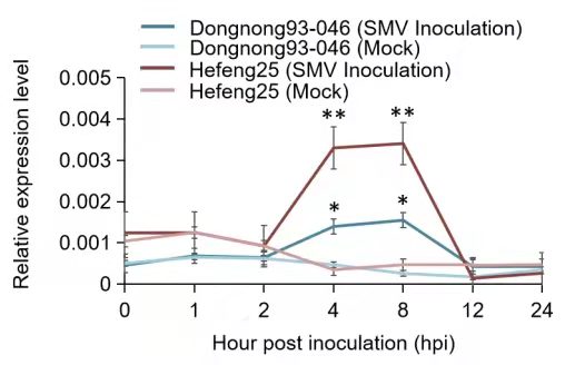 圖4 SMV抗性Dongnong93-046和對SMV性Hefeng25中的GmST1基因表達分析