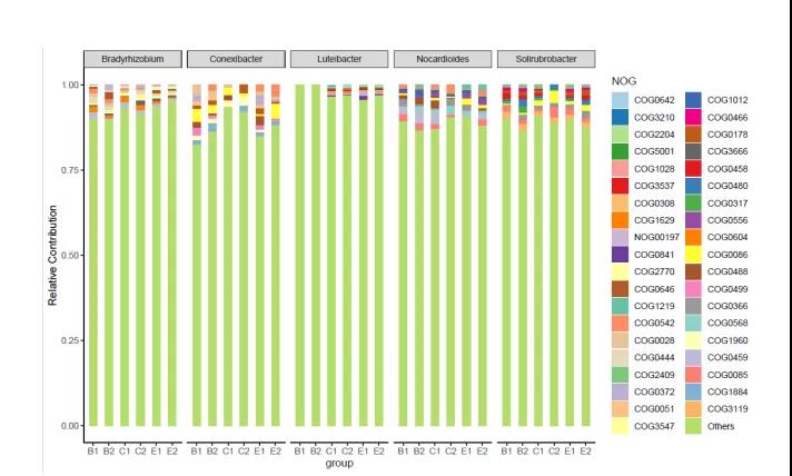 根據(jù)樣本的物種、功能的對應關系,進行物種與功能相對豐度的關聯(lián)分析,可以得到特定物種的功能貢獻度、特定功能的物種貢獻度。該分析既可以指定kegg、eggNOG、GO、Pfam、CAZy、CARD、VFDB、PHI-base、P450數(shù)據(jù)庫的TOP/高豐度功能或代謝途徑主要存在于哪些物種,也可以分析TOP/高豐度物種的主要功能或代謝途徑。