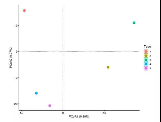 分型分析,主要通過統(tǒng)計聚類的方法研究不同樣本菌群物種/功能結(jié)構(gòu)的分型情況。分型分析過程中一般不考慮環(huán)境因子等外部因素的影響。通過分型分析,可以將菌群物種/功能結(jié)構(gòu)相似的不同樣本聚為一類,主要適用于特定環(huán)境樣本的菌群/功能分型,如腸道型(enterotypes)、口腔分型等。通常根據(jù)菌群在所選分類水平上的相對豐度,計算 Jensen-Shannon Distance和PAM (Partitioning Around Medoids)進行聚類,通過 Calinski-Harabasz (CH)指數(shù)計算最佳聚類 K 值,然后采用 Between-class analysis (BCA)或principal coordinates analysis (PCoA)進行可視化。