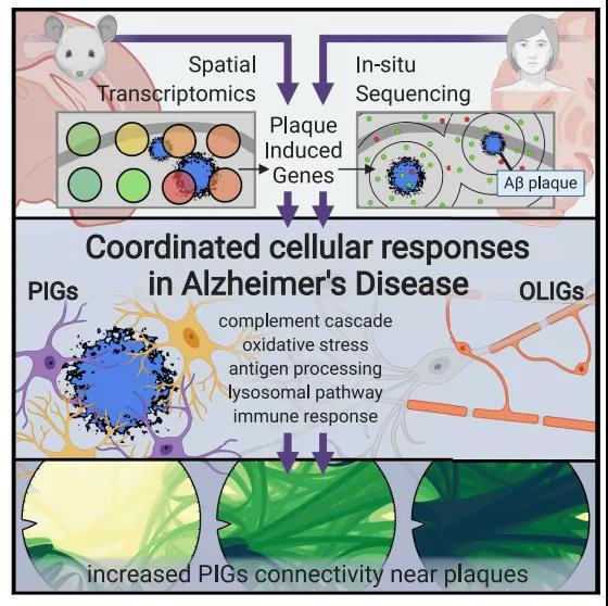本研究利用空間轉(zhuǎn)錄組對AD小鼠模型中淀粉樣斑塊組織區(qū)域進(jìn)行研究,發(fā)現(xiàn)了斑塊誘導(dǎo)的基因(PIGs)注釋到氧化應(yīng)激和炎癥等相關(guān)通路上。此外通過對小鼠和人腦切片進(jìn)行原位測序(ISS),證實了基因的變化。因此,空間轉(zhuǎn)錄組測序為探究AD相關(guān)腦部組織致病特征提供了可能。