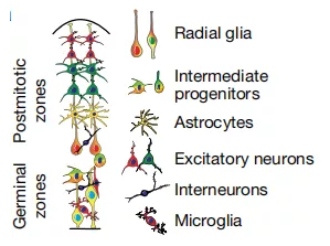 圖1:發(fā)育中皮質(zhì)的橫截面示意圖,顯示了主要細(xì)胞類型。