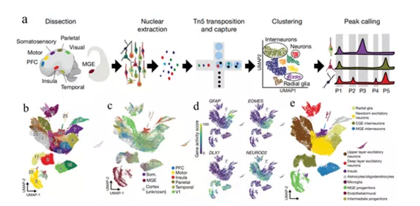 染色質(zhì)狀態(tài)通過(guò)調(diào)節(jié)基因調(diào)控元件(如增強(qiáng)子)的可及性來(lái)確定基因組的功能結(jié)構(gòu),這些元件是轉(zhuǎn)錄調(diào)節(jié)因子的結(jié)合位點(diǎn)。在發(fā)育過(guò)程中,轉(zhuǎn)錄因子的順序級(jí)聯(lián)逐漸重塑,并且不同細(xì)胞類型呈現(xiàn)出染色質(zhì)可及性的差異化。盡管染色質(zhì)的可及性是細(xì)胞特性的一個(gè)基本特征,但關(guān)于大腦發(fā)育過(guò)程中染色質(zhì)狀態(tài)變化的研究相對(duì)較少。目前單細(xì)胞基因組學(xué)已經(jīng)能夠使用scATAC-seq以細(xì)胞分辨率對(duì)染色質(zhì)狀態(tài)進(jìn)行可伸縮分析。在發(fā)育中的小鼠大腦中,scATAC-seq揭示了作為神經(jīng)發(fā)育過(guò)程基礎(chǔ)的染色質(zhì)可及性的高度動(dòng)態(tài)變化。有必要將這些研究擴(kuò)展到人類初級(jí)組織,以便更好地了解非編碼調(diào)控元件(包括人類特有的神經(jīng)發(fā)育增強(qiáng)子)的突變?nèi)绾胃蓴_正常的發(fā)育過(guò)程,并導(dǎo)致精神神經(jīng)發(fā)育障礙的遺傳基礎(chǔ)。