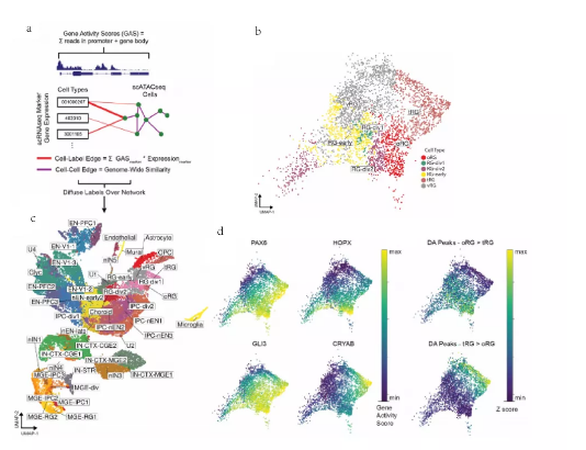 使用基因活性分?jǐn)?shù)來(lái)區(qū)分細(xì)胞類型,鑒定了多種主要的細(xì)胞類型,包括放射狀膠質(zhì)細(xì)胞(RGS)、中間前體細(xì)胞(IPC)、深層(皮質(zhì)V-VI層)興奮性神經(jīng)元(dlENs)、上層(皮質(zhì)II-IV層)興奮性神經(jīng)元(UlENs)、MGE和CGE來(lái)源的皮質(zhì)中間神經(jīng)元(分別為IN-MGES和IN-CGES)、胰島神經(jīng)元、MGE的前體細(xì)胞、小神經(jīng)膠質(zhì)細(xì)胞、少突膠質(zhì)前體細(xì)胞(OPCs)、內(nèi)皮細(xì)胞以及壁細(xì)胞。此外,結(jié)合scRNA-seq數(shù)據(jù),使用CellWalker將scATAC-seq細(xì)胞與細(xì)胞類型匹配。CellWalker以更精細(xì)的分辨率識(shí)別細(xì)胞類型和更廣泛的細(xì)胞亞型。此外,作者可以在兩種亞型(TRGS和ORGS)之間識(shí)別出不同的開(kāi)放區(qū),這兩種亞型分別表達(dá)CRYAB和HOPX,這表明scATAC-seq能夠在高分辨率下區(qū)分細(xì)胞亞型,具有更高的靈敏度。