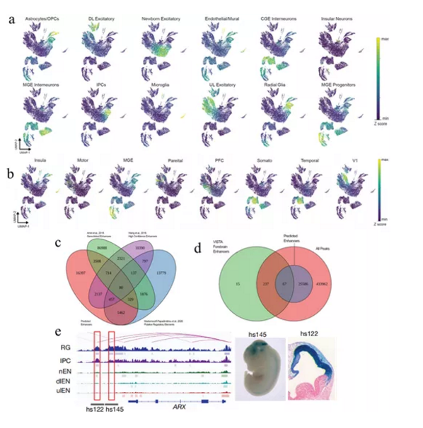 為了鑒定候選增強(qiáng)子,整合了ATAC-seq、CUT&Tag、Hic和基因表達(dá)數(shù)據(jù),并使用接觸活性算法來(lái)預(yù)測(cè)所有類型的皮質(zhì)細(xì)胞的增強(qiáng)子-基因相互作用。共預(yù)測(cè)了25,659個(gè)基因連鎖增強(qiáng)子。其中在發(fā)育中的人皮層分離的細(xì)胞上進(jìn)行了染色質(zhì)免疫沉淀和測(cè)序(PLAC-seq),發(fā)現(xiàn)了67,493個(gè)開(kāi)放區(qū)以及10,050個(gè)預(yù)測(cè)的增強(qiáng)子,這些開(kāi)放區(qū)和預(yù)測(cè)的增強(qiáng)子與預(yù)測(cè)的細(xì)胞類型特異性增強(qiáng)子相關(guān)的基因被富集。為了進(jìn)一步驗(yàn)證注釋的z確性,將開(kāi)放區(qū)與從人類皮質(zhì)組織樣本生成的公開(kāi)可用數(shù)據(jù)進(jìn)行關(guān)聯(lián)分析。發(fā)現(xiàn)scATAC-seq鑒定到了混合測(cè)序數(shù)據(jù)注釋的大多數(shù)開(kāi)放區(qū),并且還鑒定了許多在混合數(shù)據(jù)中未預(yù)測(cè)的細(xì)胞類型特異性peaks,特別是富集在諸如小神經(jīng)膠質(zhì)細(xì)胞和內(nèi)皮細(xì)胞的稀有細(xì)胞群體中的開(kāi)放區(qū)。在功能驗(yàn)證的前腦增強(qiáng)子中,大多數(shù)(319個(gè)中的304個(gè))與染色質(zhì)可及性開(kāi)放區(qū)重疊,但只有67個(gè)重疊的增強(qiáng)子是通過(guò)激活接觸方法進(jìn)行預(yù)測(cè)??傊?,這些分析表明,scATAC-seq是一種從異質(zhì)組織樣本中檢測(cè)染色質(zhì)可及性模式的可靠方法。然而,預(yù)測(cè)的增強(qiáng)子與以前發(fā)表的研究的有限重疊表明,迫切需要更好地理解預(yù)測(cè)調(diào)控潛力的計(jì)算機(jī)算法的相關(guān)特征。