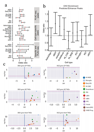 不同發(fā)育階段和分化狀態(tài)的染色質(zhì)狀態(tài)的細(xì)胞分辨率數(shù)據(jù)可能提供突變和發(fā)育中的不同細(xì)胞類型選擇性脆弱性之間的聯(lián)系。為此,研究者將特定細(xì)胞類型的ATAC-seq peaks和預(yù)測(cè)的增強(qiáng)子與疾病相關(guān)的常見(jiàn)和罕見(jiàn)的非編碼突變體記性關(guān)聯(lián)分析。首先分析了細(xì)胞類型特異性的peaks sets、預(yù)測(cè)的增強(qiáng)子、啟動(dòng)子相互作用區(qū)域與基因組區(qū)域重疊的peaks值,這些區(qū)域在發(fā)育遲緩的個(gè)體中富集了拷貝數(shù)變異;結(jié)果發(fā)現(xiàn)dlEN、內(nèi)皮/壁層和小神經(jīng)膠質(zhì)細(xì)胞特異性peaks顯著富集,以及中間神經(jīng)元中重疊啟動(dòng)子相互作用區(qū)的peaks顯著富集。
