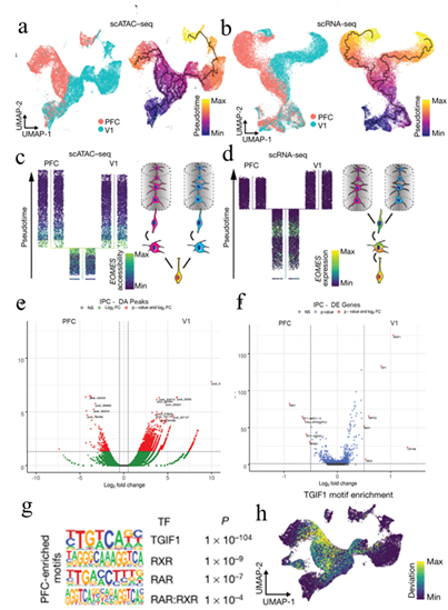 在神經(jīng)發(fā)生的早期,出現(xiàn)了特定區(qū)域類型的皮質(zhì)興奮性神經(jīng)元,但在不同區(qū)域的前體細(xì)胞之間只發(fā)現(xiàn)了有限的轉(zhuǎn)錄差異。調(diào)控元件的可及性變化通常先于基因表達(dá)。研究者比較了頭-尾軸兩端、PFC和V1的興奮性譜系細(xì)胞的scRNA-seq和scATAC-seq圖譜。在每種模式中,對(duì)細(xì)胞進(jìn)行擬時(shí)間分析,確定分化軌跡,并沿著該軌跡確定PFC和V1譜系之間轉(zhuǎn)錄或染色質(zhì)狀態(tài)差異變得明顯的“分支點(diǎn)”。與轉(zhuǎn)錄組數(shù)據(jù)揭示了興奮性神經(jīng)元的區(qū)域特異性分群不同的是,染色質(zhì)狀態(tài)特征表明PFC和V1中間前體細(xì)胞群體之間存在顯著差異。在轉(zhuǎn)錄水平上,PFC和V1IPCs只有少數(shù)幾個(gè)基因有差異表達(dá),而染色質(zhì)可及性分析發(fā)現(xiàn)這些細(xì)胞類型之間有1800多個(gè)差異可及區(qū)。