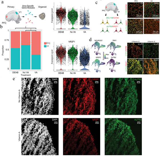 在哺乳動(dòng)物大腦發(fā)育的過(guò)程中,視黃酸信號(hào)在神經(jīng)組織中發(fā)揮著重要的作用。為了測(cè)試RA是否促進(jìn)人類PFC的分化,在含有或不含有維生素A(RA合成的前體)的情況下培養(yǎng)皮質(zhì)類器官。同時(shí)利用DEAB(一種有效的RA合成抑制劑)處理與維生素A一起培養(yǎng)的腦類器官。在分化的第10周,此時(shí)深層神經(jīng)正在發(fā)生,利用scRNA-seq分析了腦類器官。發(fā)現(xiàn)在維生素A存在下培養(yǎng)的興奮性前腦神經(jīng)元與不含維生素A或在DEAB存在下培養(yǎng)的腦類器官的神經(jīng)元是分開(kāi)聚類的。還發(fā)現(xiàn)了區(qū)分PFC和V1皮層神經(jīng)元的信號(hào)。利用目前的分類方法注釋類器官神經(jīng)元中的PFC和V1神經(jīng)元的特征;與未使用維生素A培養(yǎng)或使用DEAB處理的神經(jīng)元相比,維生素A培養(yǎng)的類器官中PFC類似神經(jīng)元的比例始終較高。免疫染色證實(shí)了基因產(chǎn)物的差異表達(dá),并發(fā)現(xiàn)與含有維生素A培養(yǎng)的腦類器官的PFC特性一致。這些發(fā)現(xiàn)表明,RA信號(hào)通路有助于人類皮質(zhì)發(fā)育過(guò)程中PFC神經(jīng)元譜系的發(fā)育。