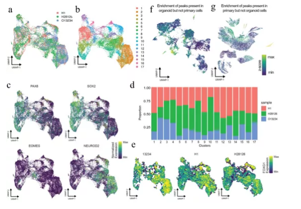 圖9:腦類器官和原代組織的peaks比較揭示染色質(zhì)圖譜的顯著差異