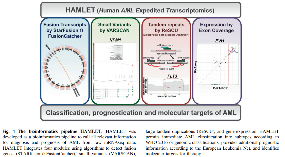然而,急性髓細胞白血病的z確分類需要不同的技術來捕獲結構多樣的基因突變,如較大的插入和缺失(indels)、融合基因和除小變異外的結構性染色體變異。此外,結構正?;虻谋磉_水平可對預后產生決定性影響。因此,在當前的技術平臺下,急性髓細胞白血病診斷及風險評估仍然繁瑣、貴,且不完整。為了解決這一需求,我們實施了全轉錄組RNA測序(mRNAseq),作為獲取與當前和未來分類和風險分類相關的所有遺傳信息的單一平臺。在這種診斷范式中,一個經認可的mRNAseq協議獲取診斷樣本的全面數據。對于單次運行數據分析,我們開發(fā)了一個指定的集成生物信息管道(人類急性髓細胞白血病快速轉錄組學(HALLET);Fig. 1)。HAMLET具有靈活的適應性和個性化,可以查詢一組選定基因的序列變異和表達水平,以及易位情況。