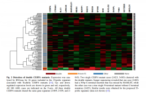 等位基因的CEBPA突變?yōu)楹诵驼5腁ML帶來了良好的預后并且將一個等位基因上編碼序列的第一個357 bp內的N-末端移碼突變與c.834-1074之間的C-末端框內插入或缺失相結合,從而破壞另一個等位基因上的DNA結合。通過Illumina平臺上通??色@得的reads長度來證明它們在相反染色體上的位置。然而,雙等位基因CEBPA突變與特定的基因表達譜有關?;趍RNAseq的基因表達譜顯示了特征性的雙等位基因CEBPA攜帶兩個樣本的所有四個急性髓系白血病樣本的突變相關特征CEBPA突變(2-009、2-039、2-045和3-003),包括其C端突變被HAMLET遺漏的病例3-003(圖3)。11例急性髓系白血病中,有一例CEBPA變異,一個病例(2-025)的特征性N-末端移碼突變與雙聚在一起CEBPA變異。因此,將變異檢測與基因表達譜結合分析,可以單獨解決變異檢測的不確定性。由于CEBPA 雙突變體的基因標記不是定量的,所以尚未在HAMLET中實施臨床應用。