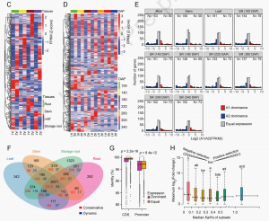 蛋白質(zhì)編碼基因、不同等位基因和顯性表達的雙等位基因的密度,發(fā)現(xiàn)它們都傾向于富集在高度雜合的區(qū)域,通常位于染色體的一端或兩端附近。通過對不同種植時間和組織部位的轉(zhuǎn)錄組分析發(fā)現(xiàn)除了第1、15和17對染色體外,幾乎所有同源染色體對中,雙等位基因間廣泛發(fā)生表達不平衡,并且淀粉和蔗糖代謝途徑上的雙等位基因表現(xiàn)出顯著的表達分化;