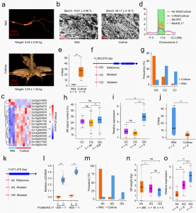 馴化使木薯塊根的產(chǎn)量和淀粉含量顯著增加。栽培品種的塊根重和淀粉含量分別比野生后代高約60倍和3倍(圖4a,b)。選擇性清除分析結(jié)合轉(zhuǎn)錄組分析發(fā)現(xiàn)2號染色體MeT