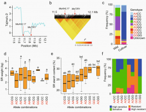 MeAHL17和MeTIR1位于2號染色體上相同的選擇性清除區(qū)內(nèi)。連鎖不平衡分析發(fā)現(xiàn),兩個基因緊密連鎖,攜帶AG(MeAHL17)和GG(MeTIR1)等位基因組合的品種顯示出較高的淀粉含量和對木薯細菌性枯萎病的高抗性頻率。