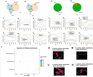 在本研究中,作者生成了斑馬魚(yú)幼魚(yú)的時(shí)間表達(dá)轉(zhuǎn)錄本圖譜,揭示了調(diào)控斑馬魚(yú)幼魚(yú)lncRNAs表達(dá)譜的晝夜動(dòng)態(tài)。本研究發(fā)現(xiàn)了3220個(gè)lncRNAs在DD和LL條件下的表達(dá)譜,鑒定了578個(gè)周期表達(dá)的lncRNAs,并使用GO、COG和KEGG途徑富集分析對(duì)其進(jìn)行注釋,結(jié)果表明,大多數(shù)這些節(jié)律表達(dá)的幼魚(yú)lncRNAs可能參與了關(guān)鍵的生物學(xué)過(guò)程。通過(guò)比較來(lái)自松果體和精巢的lncRNAs,發(fā)現(xiàn)9個(gè)(DD)和12個(gè)(LL)幼魚(yú)lncRNAs分別在斑馬魚(yú)松果體和精巢中共同表達(dá),在這些共表達(dá)的lncRNAs編碼的多肽中,發(fā)現(xiàn)3個(gè)多肽(DD)和1個(gè)多肽(LL)具有蛋白質(zhì)數(shù)據(jù)庫(kù)中已知的結(jié)構(gòu)域。作者研究了這些共表達(dá)的lncRNAs編碼的多肽,以預(yù)測(cè)它們的3D模型和功能。此外,對(duì)人類、小鼠和果蠅的幼魚(yú)lncRNAs進(jìn)行了保守分析,發(fā)現(xiàn)斑馬魚(yú)幼魚(yú)在DD和LL條件下分別與人類共享35和42個(gè)lncRNAs,與小鼠共享1個(gè)和4個(gè)lncRNAs。作者選擇了這三個(gè)物種共享的5種節(jié)律表達(dá)的lncRNAs進(jìn)行編碼性研究,發(fā)現(xiàn)了這5種lncRNAs編碼的數(shù)百種多肽,對(duì)這些保守肽研究了它們的三維模型和相應(yīng)的已知結(jié)構(gòu)域,發(fā)現(xiàn)在α-螺旋、β-鏈和隨機(jī)卷曲方面具有相似性。這些結(jié)果將幫助晝夜節(jié)律生物學(xué)家選擇晝夜表達(dá)的lncRNA,以進(jìn)行進(jìn)一步的功能研究。