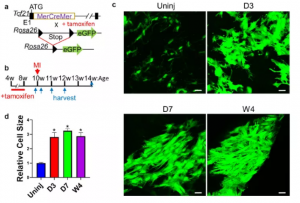 本文采用他莫昔芬對(duì)小鼠進(jìn)行處理,并手術(shù)誘導(dǎo)心肌梗死(MI)(圖 1a,b)。未受傷心肌和梗死區(qū)的共聚焦成像顯示MI后心臟成纖維細(xì)胞數(shù)量顯著增加,心臟成纖維細(xì)胞也變大了(圖1c,d))。