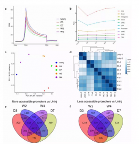 ATAC-seq:新鮮分選的來(lái)自小鼠未受傷心肌和心肌梗死后第3天、第7天、第2周、第4周梗死區(qū)的心臟成纖維細(xì)胞,每組設(shè)置兩個(gè)重復(fù)