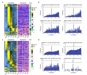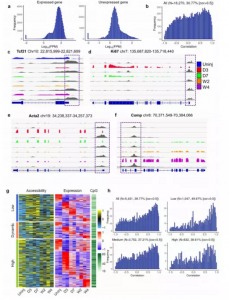 然后根據(jù)檢測(cè)到的啟動(dòng)子的可及性對(duì)它們進(jìn)行分類(lèi):高可及性組,低可及性組和動(dòng)態(tài)可及性組。發(fā)現(xiàn)在三個(gè)組中,很多基因的啟動(dòng)子可及性和轉(zhuǎn)錄水平有很強(qiáng)的相關(guān)性,但是在高可及性組中有一些基因的啟動(dòng)子可及性和轉(zhuǎn)錄組水平有著較弱的或者無(wú)相關(guān)性。有趣的是,具有高啟動(dòng)子可及性的基因具有最高的CpG密度,而具有低啟動(dòng)子可及性的基因具有最低的CpG密度(圖4g)。當(dāng)根據(jù)啟動(dòng)子中的CpG密度將5,431個(gè)差異表達(dá)基因分為3組時(shí),發(fā)現(xiàn)CpG密度較低但具有很強(qiáng)的正相關(guān)性的基因占比最高,進(jìn)一步表明DNA甲基化可以獨(dú)立調(diào)控基因轉(zhuǎn)錄,而與啟動(dòng)子染色質(zhì)可及性無(wú)關(guān)(圖4h)。