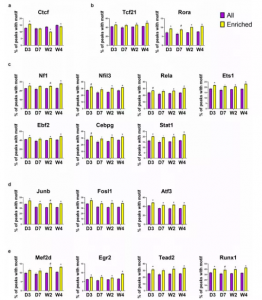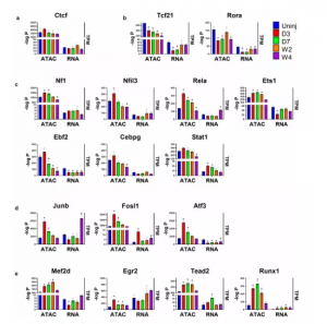 接下來(lái)分析每個(gè)分組中這17個(gè)TF motif在遠(yuǎn)端ATAC-seq 峰中的結(jié)合位點(diǎn),發(fā)現(xiàn)與未受傷組相比,對(duì)應(yīng)的靶基因在MI后的分組樣本的心臟成纖維細(xì)胞中是上調(diào)的。分析結(jié)果說(shuō)明除了Ctcf,大多數(shù)MI后的分組樣本中的TF motif在遠(yuǎn)端ATAC-seq峰對(duì)應(yīng)的上調(diào)靶基因區(qū)域中的富集程度高于所有遠(yuǎn)端ATAC-seq峰(圖7a-e)。