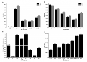 六個(gè)樣本的平均全長(zhǎng)嵌合序列FLNC讀取率達(dá)到80.68%,平均獲得20360個(gè)非冗余轉(zhuǎn)錄本,平均N50長(zhǎng)度和平均長(zhǎng)度分別為1607bp和1378bp(表 1),這比之前獲得的根轉(zhuǎn)錄組數(shù)據(jù)要好。LR和HR組的平均AS事件分別為1408和1605??勺兗羟蟹治鼋Y(jié)果顯示最常見(jiàn)的剪接類(lèi)型是內(nèi)含子保留,LR組占45.41%,在HR組占有46.29%(圖1 A)?;コ馔怙@子最不常見(jiàn),在LR和HR轉(zhuǎn)錄組中分別為0.86%和1.04%。APA分析顯示具有一個(gè)多聚(A)位點(diǎn)的基因數(shù)量最高,LR和HR組的平均基因數(shù)分別為3896和3733,具有五個(gè)多聚(A)位點(diǎn)的轉(zhuǎn)錄本數(shù)量最低,分別為1242和1386(圖1B)。文中共對(duì)54135個(gè)序列(77606351bp)進(jìn)行了SSR分析,包括16354個(gè)SSR序列和12855個(gè)含有SSR的序列。此外,單核苷酸、二核苷酸、三核苷酸、四核苷酸、五核苷酸和六核苷酸的數(shù)量分別為5522、4258、6139、176、44和215。其中,三核苷酸SSR的密度最高,為68(圖1C)。