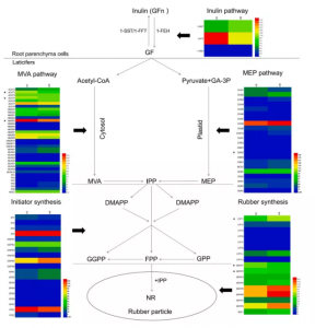 橡膠草(Taraxacum kok-saghyz,TKS)是一種小型、二倍體、有性生殖、蓮座狀多年生植物。它屬于菊科植物,起源于中國(guó)和哈薩克斯坦的天山山區(qū)。TKS的根部可以產(chǎn)生大量的天然橡膠(Natural rubber,NR)(高達(dá)20%干重),其分子量與巴西橡膠樹(shù)相似。TKS具有種植面積廣、NR含量和質(zhì)量高、易于種植和收獲、成熟時(shí)間短等優(yōu)點(diǎn),因此TKS是一種具有商業(yè)前景的優(yōu)質(zhì)NR替代源。然而,高雜合度和自交不親和導(dǎo)致的近交衰退是將TKS培育成NR生產(chǎn)作物的嚴(yán)重挑戰(zhàn)。更好地理解NR生物合成途徑和相關(guān)基因,以及TKS中相互競(jìng)爭(zhēng)的代謝途徑,將有助于選擇合適的經(jīng)典或生物技術(shù)育種策略來(lái)改善TKS培育。迄今為止,許多與NR生物合成相關(guān)的基因已在TKS和其他NR生產(chǎn)植物中被鑒定。TKS基因組組裝于2017年構(gòu)建,鑒定出40個(gè)屬于MVA途徑的基因、19個(gè)參與起始劑合成的基因和20個(gè)參與NR合成的基因。然而,關(guān)于TKS中NR生物合成的分子機(jī)制的知識(shí)仍然是不完整和難以捉摸的。