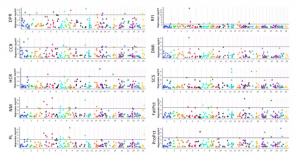 在牛的CNV變異研究中,利用已發(fā)表的1,116個牛中的鑒定的25,030個CNVs,基于不同性狀(功能、健康、繁殖等)的CNVs進行GWAS,并評估其對養(yǎng)殖和育種實踐的影響,結(jié)果顯示,共有56個CNVs與8個表型性狀中的一個或多個顯著相關(guān),其中12號染色體上的3個CNVs與產(chǎn)脂性狀和乳腺性狀的顯著關(guān)聯(lián),這些CNVs位于23個不同的基因上,該研究是首次對如此大的瑞士奶牛樣本進行基因組分析,將CNVs與繁殖、乳腺和健康性狀聯(lián)系起來。同樣,基于在528個荷斯坦奶牛中鑒定的197個CNVs(圖4),對473頭牛10個重要生產(chǎn)性狀進行GWAS分析,共檢測到57個CNVs與至少一個性狀顯著相關(guān)(圖5),對這些CNVs與候選基因的潛在重疊進行分析,預(yù)測得到一些表型相關(guān)的候選基因,該研究結(jié)果對荷斯坦奶牛的基因組鑒定了CNV,并提供了影響飼料效率和采食相關(guān)性狀變異的候選基因。
