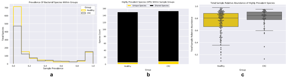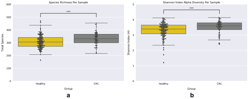 使用基于em的方法計(jì)算每個(gè)樣本內(nèi)物種的相對(duì)豐度,以構(gòu)建一個(gè)樣本分類(lèi)單元矩陣,通過(guò)測(cè)量每個(gè)樣本的細(xì)菌豐富度和Shannon指數(shù),利用該矩陣探究?jī)蓚€(gè)樣本組(健康和晚期CRC)的微生物多樣性。CRC組的樣本顯示出更大的多樣性,包括豐富度和Shannon指數(shù)(Mann-Whitney U檢驗(yàn):MWU);豐富度:MWU pvalue = 0.0005, Shannon指數(shù):MWU pvalue = 0.0009)(圖一a,b)。由于物種多樣性的量度對(duì)物種均勻度和豐富度的敏感性不同,還應(yīng)用了辛普森指數(shù)來(lái)計(jì)算樣本組內(nèi)的物種多樣性,這些結(jié)果與之前的分析一致,CRC樣本中的物種多樣性與健康樣本中的物種多樣性有顯著性差異(MWU值= 0.0238).