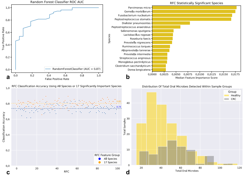 評(píng)估健康和晚期結(jié)直腸癌相關(guān)腸道微生物群之間的細(xì)菌群落分類(lèi)特征差異。對(duì)樣本分類(lèi)群矩陣進(jìn)行CLR轉(zhuǎn)換,使用主成分分析進(jìn)行基于分類(lèi)剖面的樣本排序。前兩個(gè)主成分只能解釋總方差的一小部分(PC1: 7.98%,PC2: 5.61%),基于主成分分析的線性變換未顯示健康樣本與CRC樣本有差異,但通過(guò)隨機(jī)森林分類(lèi)器(RFC)可以區(qū)分兩個(gè)樣本組(AUC = 0.87)(圖 2a)。雖然RFC根據(jù)重要性對(duì)物種進(jìn)行排序,但這些默認(rèn)度量是有一定偏差。為獲得RFC提供的物種重要度的統(tǒng)計(jì)顯著性,在我特征集中包含一個(gè)“隨機(jī)”特征。通過(guò)使用100個(gè)RFC的集合,發(fā)現(xiàn)了17種細(xì)菌,在這些顯著“重要”物種上訓(xùn)練的100個(gè)RFC的準(zhǔn)確性分類(lèi)得分大于在所有物種上訓(xùn)練的100個(gè)RFC的準(zhǔn)確性分類(lèi)得分(所有物種平均準(zhǔn)確性為74%;17個(gè)非?!爸匾钡奈锓N平均準(zhǔn)確率為80%(圖 2c)。物種差異豐度分析顯示,與健康腸道微生物組相比,CRC相關(guān)腸道微生物組中有174個(gè)物種的相對(duì)豐度顯著降低,10個(gè)物種的相對(duì)豐度顯著升高。這174個(gè)細(xì)菌物種分別來(lái)自84個(gè)屬,大多數(shù)來(lái)自 Enterobacter(6.8%), Klebsiella(6.3%), Streptococcus(5.2%), Lactobacillus (5.1%), Citrobacter(4.6%), Bifidobacterium(4%),Bacteroides(3.4%),以及 Clostridium(3.4%)。CRC中相對(duì)豐度顯著升高的10個(gè)物種是 Parvimonas micra(qvalue = 3.09e-09), Peptostreptococcus stomatis(qvalue = 4.51e-08), Gemella morbillorum(qvalue = 4.55e-08), Fusobacterium nucleatum(qvalue = 1.08e-06), Streptococcus anginosus(qvalue = 1.13e-03), Dialister pneumosintes (qvalue=1.37e-03),Peptostreptococcus anaerobius (qvalue=4.74e-03), Streptococcus sp. KCOM 2412(Streptococcus periodonticum)(qvalue = 7.18e-03), Ruminococcus torques(qvalue = 1.55e-02),以及ilifactor alocis(qvalue = 2.85e-02)。