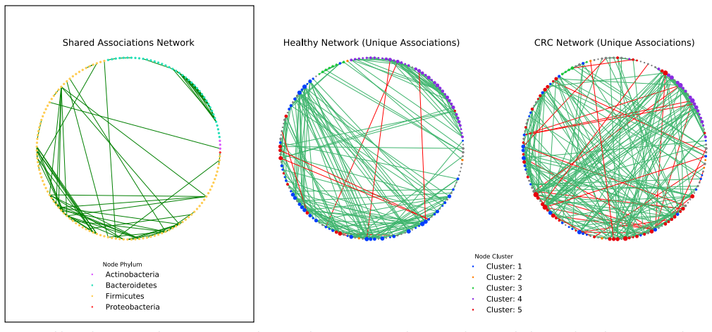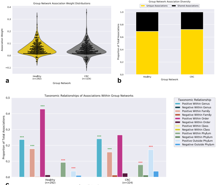 群體網(wǎng)絡(luò)包含相似的關(guān)聯(lián)權(quán)重分布,正相關(guān)比負(fù)相關(guān)更多(圖4a)。值得注意的是,與健康網(wǎng)絡(luò)相比,CRC包含更多的負(fù)相關(guān)。29%的負(fù)相關(guān)涉及一種被認(rèn)為是口腔微生物的物種,而在健康網(wǎng)絡(luò)中,沒(méi)有發(fā)現(xiàn)涉及口腔菌群。在網(wǎng)絡(luò)中發(fā)現(xiàn)的大多數(shù)關(guān)聯(lián)是該網(wǎng)絡(luò)獨(dú)有的(健康:69%,CRC:72%)(圖4b)。我們假設(shè)群落結(jié)構(gòu)的這種巨大差異可以反映生態(tài)系統(tǒng)的變化,并進(jìn)而分析了網(wǎng)絡(luò)中物種之間的分類(lèi)關(guān)系(圖4c)。兩個(gè)網(wǎng)絡(luò)在同一屬內(nèi)的物種(健康:MCS pvalue= 0.00099,CRC:MCS pvalue= 0.00099)和家族(健康:MCS值= 0.00099,CRC:MCS= 0.00099 )。然而,只有在健康組的網(wǎng)絡(luò)中,物種與來(lái)自同一順序的其他物種的積極相關(guān)仍然明顯多于隨機(jī)相關(guān)(健康:MCS pvalue= 0.00099,CRC: MCS pvalue = 0.44)。與健康網(wǎng)絡(luò)(健康:4%,CRC:17%)相比,CRC的網(wǎng)絡(luò)在分類(lèi)上的遠(yuǎn)緣關(guān)系中顯示出更大的豐度,在健康網(wǎng)絡(luò)中分類(lèi)上的遠(yuǎn)緣微生物之間的正關(guān)聯(lián)仍然顯著較少(門(mén)內(nèi):MCS值= 0.00099,門(mén)外:MCSp值= 0.00099)和CRC(門(mén)內(nèi):MCS pvalue= 0.00099,門(mén)外:MCS pvalue= 0.00099)而不是隨機(jī)網(wǎng)絡(luò)。