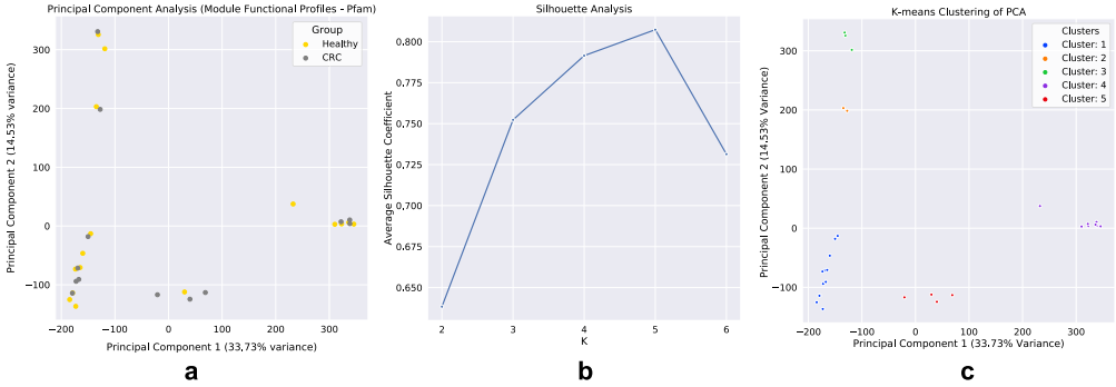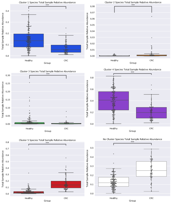 通過(guò)構(gòu)建CLR轉(zhuǎn)換的模塊功能來(lái)比較模塊的潛在功能。模塊功能(蛋白域)圖譜的PCA顯示出較大的差異(PC1: 33.73%,PC2: 14.53%),模塊似乎形成包含兩組代表的簇團(tuán)(圖 5a)。為了定義模塊的聚類(lèi),進(jìn)行了輪廓分析,估計(jì)五個(gè)聚類(lèi)作為用于K-均值聚類(lèi)的最*K值(圖?5b)。通過(guò)K-均值聚類(lèi)定義模塊聚類(lèi)后(圖?5c)對(duì)這些集群進(jìn)行了分類(lèi)分析。在整個(gè)網(wǎng)絡(luò)中,同一集群內(nèi)的模塊被發(fā)現(xiàn)在分類(lèi)學(xué)上是相似的,不包括簇1和簇5,簇1和簇5顯示出物種占有的變化,其中在健康網(wǎng)絡(luò)的簇1內(nèi)發(fā)現(xiàn)的一些物種被顯示在CRC組的簇5內(nèi)。然而,兩個(gè)網(wǎng)絡(luò)對(duì)在簇2、3和4中發(fā)現(xiàn)的物種有很強(qiáng)的一致性。第2組中的物種僅有“致病菌”(即通常無(wú)害但在特定環(huán)境條件下具有致病能力的物種)口腔微生物,而簇3主要是鏈球菌種和簇4主要類(lèi)桿菌種。隨后,進(jìn)行聚類(lèi)功能分析以發(fā)現(xiàn)蛋白質(zhì)結(jié)構(gòu)域,以及蛋白質(zhì)家族的主要作用和次要作用,這使得聚類(lèi)在功能上不同。簇1的功能與細(xì)胞表面粘附、對(duì)抗沖突策略、酪氨酸重組酶、多糖降解、糖胺聚糖結(jié)合、腫瘤蛋白酶抑制、過(guò)氧化物酶功能、碳水化合物/纖維素結(jié)合活性和氨基酸生物合成相關(guān)。簇2的功能涉及對(duì)宿主細(xì)胞和細(xì)胞外基質(zhì)的粘附、細(xì)胞感染、膠原結(jié)合、補(bǔ)體抗性、鳥(niǎo)氨酸/賴(lài)氨酸/精氨酸脫羧酶(組織腐敗/多胺合成/酸性環(huán)境抗性)、金屬肽酶、V型分泌系統(tǒng)、氨的產(chǎn)生和有毒金屬離子的排泄(銅流出系統(tǒng))、細(xì)胞包膜、DNA代謝、脂肪酸和磷脂代謝、表面多糖和脂多糖的生物合成和降解。簇3的功能與粘蛋白結(jié)合、鋅清除/吸收、細(xì)胞表面粘附、葡萄糖結(jié)合/轉(zhuǎn)運(yùn)和銅結(jié)合、蛋白質(zhì)和肽的命運(yùn)/合成/分泌、多糖/碳水化合物、有機(jī)醇和酸的降解方面有關(guān)。簇4的功能涉及金屬結(jié)合、二瓜氨酸環(huán)化酶/磷酸二酯酶、群體感應(yīng)、碳水化合物結(jié)合和半胱氨酸/木瓜蛋白酶、核苷和核苷酸、轉(zhuǎn)運(yùn)和結(jié)合蛋白、TCA循環(huán)、鐵攜帶以及表面多糖的降解和生物合成。最后簇5的區(qū)別功能與氨肽酶、三羧酸受體、乙醇胺轉(zhuǎn)運(yùn)、淀粉利用、木葡聚糖/多糖結(jié)合、能量代謝、氨基酸和胺、陽(yáng)離子和鐵化合物、電子轉(zhuǎn)運(yùn)以及表面多糖和脂多糖的生物合成和降解相關(guān)。檢查了在每個(gè)集群內(nèi)發(fā)現(xiàn)的用于網(wǎng)絡(luò)構(gòu)建的物種的豐度(健康:簇1 (33%)、簇2 (2%)、簇3 (5%)、簇4 (26%)、簇5 (7%)、無(wú)(27%);CRC:簇1 (19%)、簇2 (3%)、簇3 (3%)、簇4 (12%)、簇5 (30%)、無(wú)(33%)(圖6)。我們的發(fā)現(xiàn)表明,與健康組相比,在CRC中,第2類(lèi)和第5類(lèi)組模塊中發(fā)現(xiàn)的物種總數(shù)增加,第1類(lèi)、第3類(lèi)和第4類(lèi)組中發(fā)現(xiàn)的物種減少。這些結(jié)果也反映在我們發(fā)現(xiàn)的總樣本相對(duì)豐度的統(tǒng)計(jì)顯著變化中,即群內(nèi)物種在群間所占的比例(第一組: MWU值= 4.29 e-12;第二組:MWU值= 3.16 e-16;第三組:MWU值= 0.0002;第四組:MWU值= 2.62-13;第五組:MWUp值= 2.81 e-29;無(wú)集群物種:MWU值= 4.40-17(圖7)。此外,發(fā)現(xiàn)網(wǎng)絡(luò)內(nèi)的大多數(shù)負(fù)面關(guān)聯(lián)(健康:100%,CRC:96%)發(fā)生在占據(jù)不同集群類(lèi)型內(nèi)模塊的物種之間。只有在CRC中,簇1的物種之間才出現(xiàn)集群內(nèi)的負(fù)相關(guān),其中物種種類(lèi)和豐度也顯示出減少。