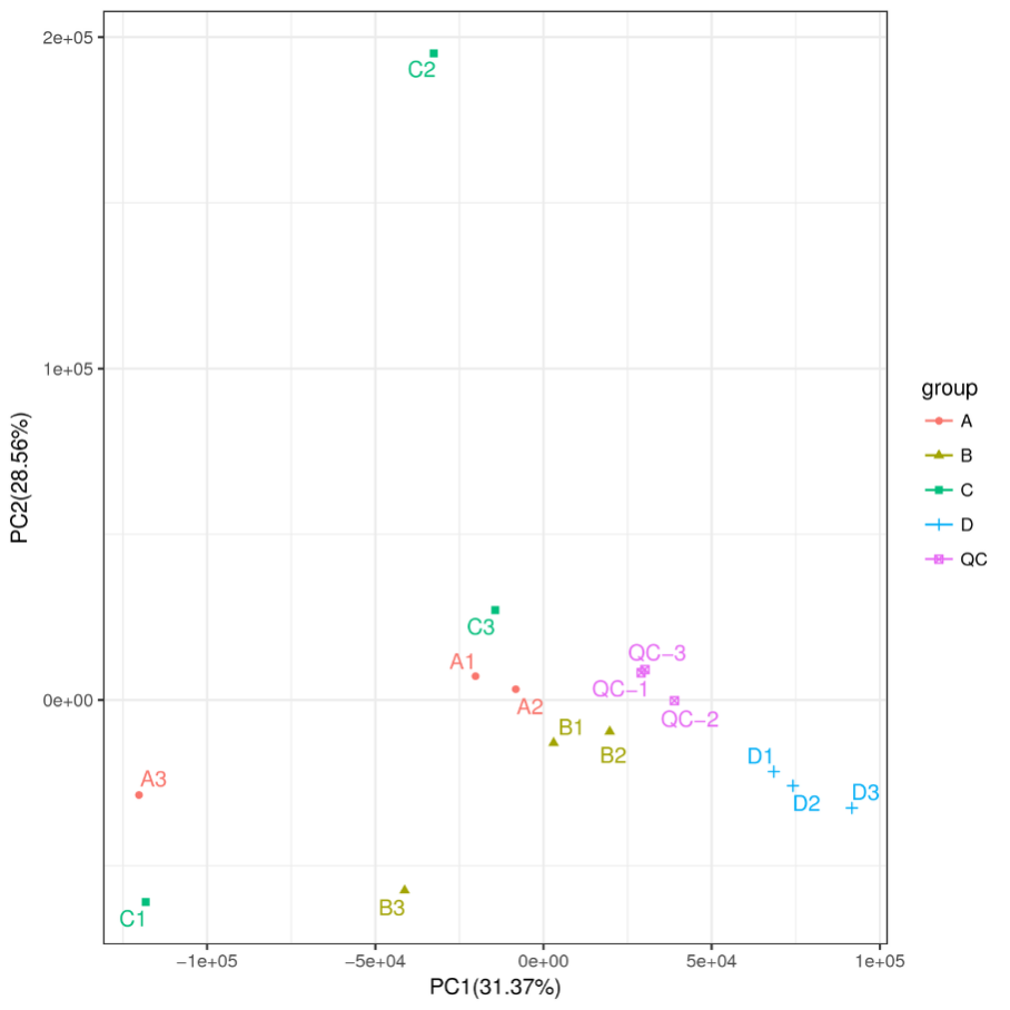 PCA圖現(xiàn)在用形狀和顏色區(qū)分更多的組,一眼就可看到組內(nèi)和組間的代謝模式差別和聚類結(jié)果。同時(shí)顯示QC樣本,通過(guò)QC更能直觀的儀器的穩(wěn)定性。