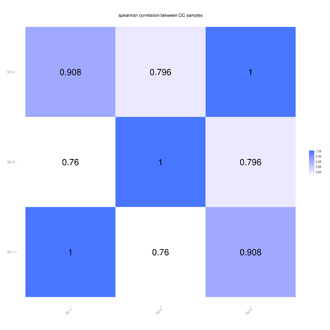 此外,新增QC樣本間的相關(guān)性, 通過(guò)計(jì)算QC樣品之間的相關(guān)性分析可以評(píng)估下機(jī)數(shù)據(jù)整體質(zhì)量,一般認(rèn)為QC樣本間相關(guān)性>0.75時(shí),數(shù)據(jù)質(zhì)量較為可靠。