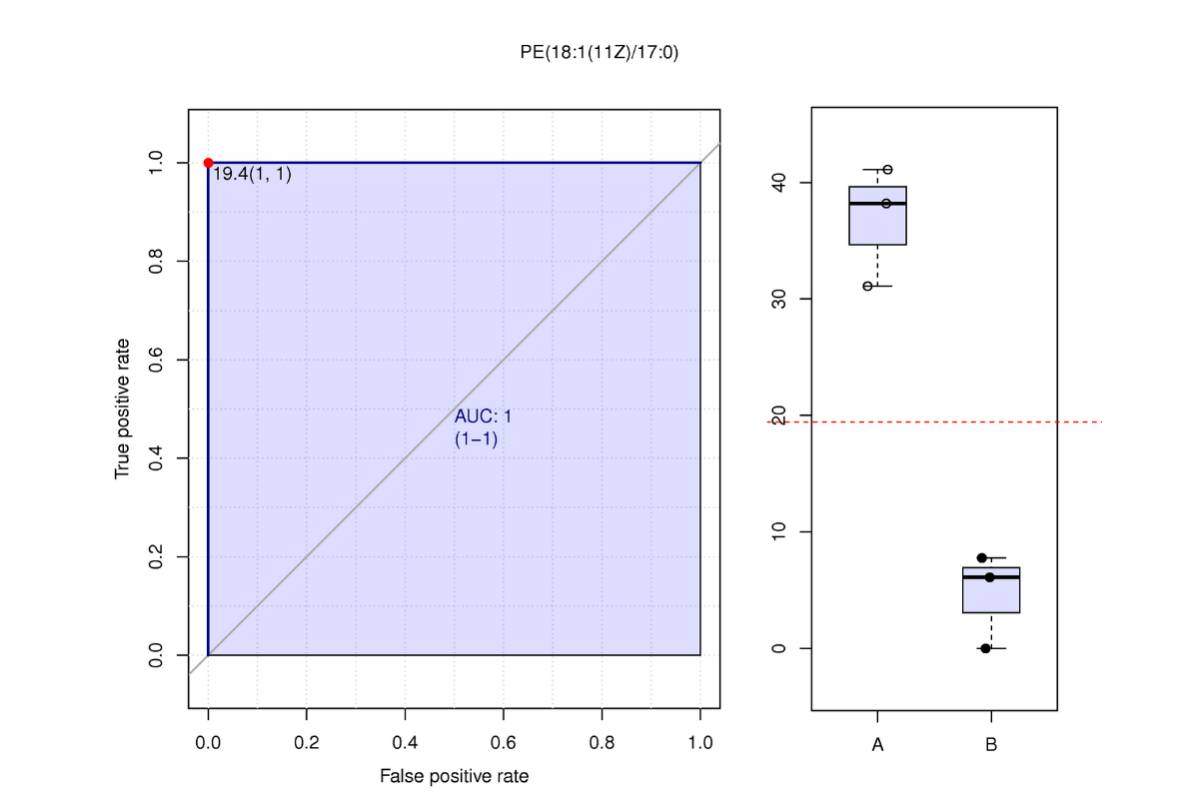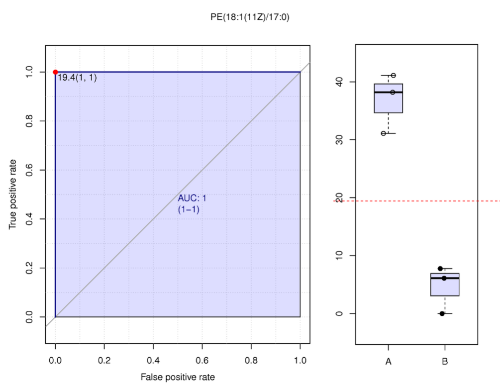 ROC曲線 (receiver operating characteristic curve) 是一種常用來(lái)篩選評(píng)估生物標(biāo)記物的分析方法[9]。AUC (Area under the curve) 是衡量ROC曲線非常有用的度量。AUC始終在0.5(兩個(gè)類在統(tǒng)計(jì)上相同)和1.0(有一個(gè)閾值可以實(shí)現(xiàn)類之間的完美分離)之間,越接近1,物質(zhì)的在對(duì)照組和實(shí)驗(yàn)組的分離就越明顯(即為潛在的生物標(biāo)記物)。一般來(lái)說(shuō),組內(nèi)生物學(xué)重復(fù)>15時(shí),ROC曲線才有足夠的點(diǎn)繪制折線,才會(huì)體現(xiàn)出較大意義。對(duì)篩選出的各組差異代謝物單獨(dú)進(jìn)行ROC分析。