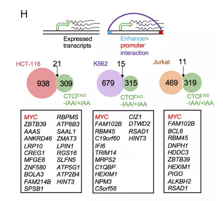 CTCF基因啟動(dòng)子的染色質(zhì)可及性在CTCF耗竭時(shí)也有所增加(圖3D),這一點(diǎn)通過定量PCR (Q-PCR)進(jìn)一步得到驗(yàn)證(圖3E)。這些數(shù)據(jù)表明CTCF可以抑制自身以保持最*表達(dá)水平。對(duì)于CTCF耗竭后被下調(diào)的基因,如MYC,并沒有在啟動(dòng)子區(qū)域檢測(cè)到有統(tǒng)計(jì)學(xué)意義的染色質(zhì)可及性變化。因此,當(dāng)啟動(dòng)子區(qū)域保持開放時(shí),遠(yuǎn)端增強(qiáng)子區(qū)域的染色質(zhì)景觀變得更難以接近,再加上CTCF耗竭,可能在控制能調(diào)控MYC轉(zhuǎn)錄的遠(yuǎn)端增強(qiáng)子-啟動(dòng)子loop環(huán)的形成中發(fā)揮作用。
