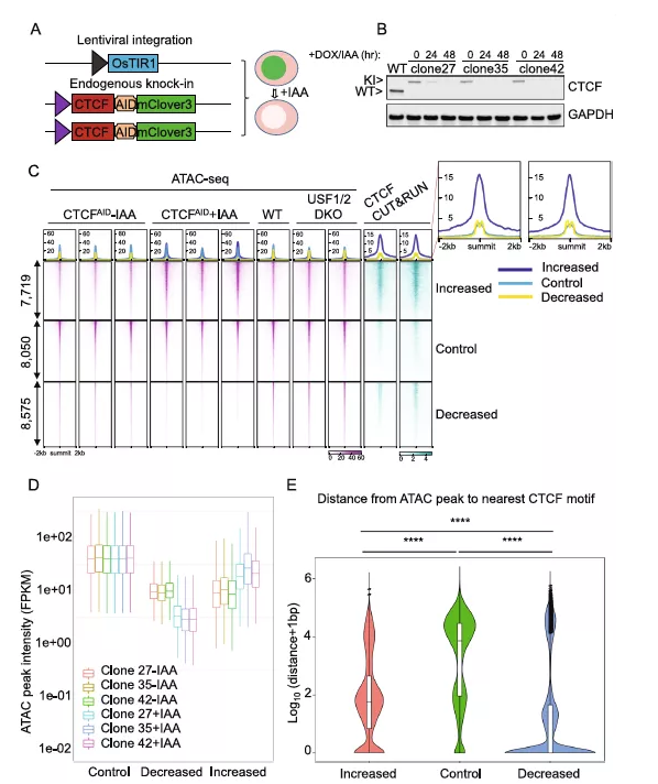 前期研究已經(jīng)通過將雙等位基因miniAID-mClover3標(biāo)簽導(dǎo)入人的內(nèi)源性CTCF位點(diǎn),并產(chǎn)生了三個(gè)CTCFAID細(xì)胞的克隆。在強(qiáng)力霉素和生長素(IAA)處理下,強(qiáng)制表達(dá)與Skp1/Culin/F-box (SCF)泛素連接酶組分連接的OsTIR1,快速降解CTCF融合蛋白(圖1A)。當(dāng)強(qiáng)力霉素和IAA完全從培養(yǎng)基中洗脫后,這種降解是可逆的。通過對(duì)三個(gè)單細(xì)胞來源的克隆進(jìn)行IAA處理24小時(shí)的免疫印跡實(shí)驗(yàn),證實(shí)了CTCF能夠有效降解(圖1B),類似于之前在48h處理?xiàng)l件下的研究結(jié)果。