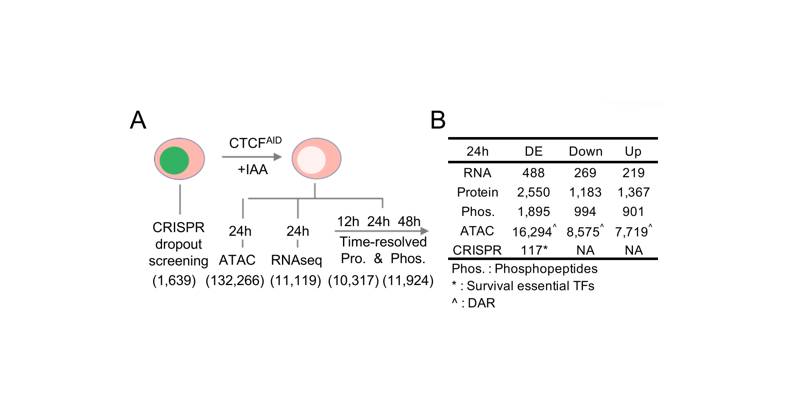 CCCTC-結(jié)合因子(CTCF)是一種高度保守的含鋅指轉(zhuǎn)錄因子,被稱為“基因組編織大師”。它是研究最廣泛的三維(3D)染色質(zhì)結(jié)構(gòu)調(diào)控因子。研究發(fā)現(xiàn)在CTCF急性衰竭細(xì)胞模型和其他基因敲除模型中,CTCF在全基因組TAD和TAD內(nèi)部loop環(huán)的形成中是不可或缺的。為了更好地理解CTCF結(jié)合占用率如何促進(jìn)轉(zhuǎn)錄調(diào)控,本文系統(tǒng)地進(jìn)行了多組學(xué)研究,特別關(guān)注染色質(zhì)可及性。通過系統(tǒng)整合了ATAC-seq、RNA-seq, WGBS, Hi-C, Cut&Run和CRISPR-Cas9基因篩選技術(shù),以及深度蛋白質(zhì)組學(xué)和磷酸化蛋白質(zhì)組學(xué)分析,用以研究CTCF蛋白急性耗竭對(duì)細(xì)胞的影響。