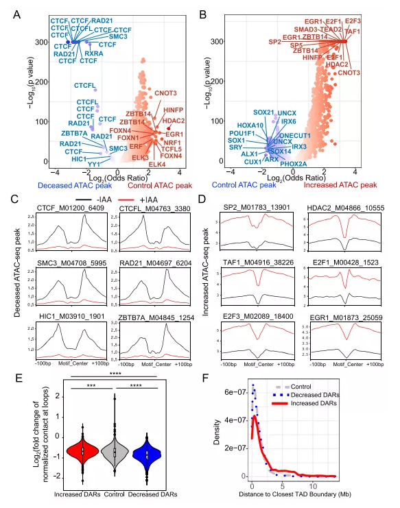 接下來分析這些DARs與它們最近的CTCF motif之間的物理距離。結(jié)果表明,可及性減弱的DARs更接近于最近的CTCF motifs。相比之下,可及性增強(qiáng)的DARs與CTCF motif的距離顯著高于可及性減弱的DARs,但顯著低于對(duì)照組(圖1E)。