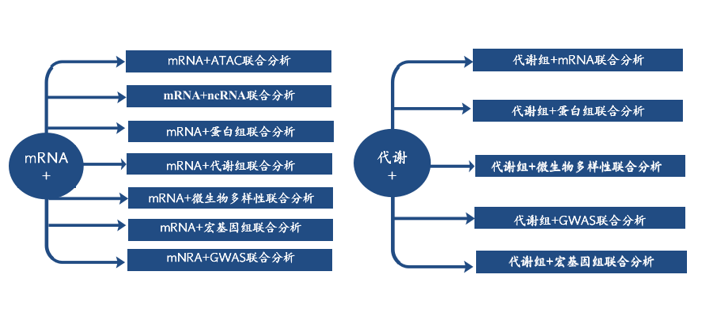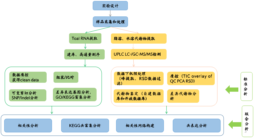 中心法則是遺傳的基礎,在中心法則中,RNA處于重要的中央樞紐地位,轉錄組作為生信科研中的“萬金油”,最大的特點就是“短平快”,是功能基因的研究利器,是利用率最高,最成熟的測序手段,在多組學聯合中扮演中重要的角色。代謝組是表型的直接體現者,“代謝組+ ”研究模式已經在多個領域廣泛使用,成為深入研究科學問題,系統(tǒng)闡釋作用機制的利器。以下就是常見的基于這兩個組學的聯合分析策略。
