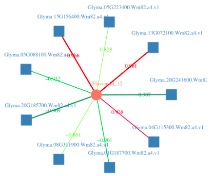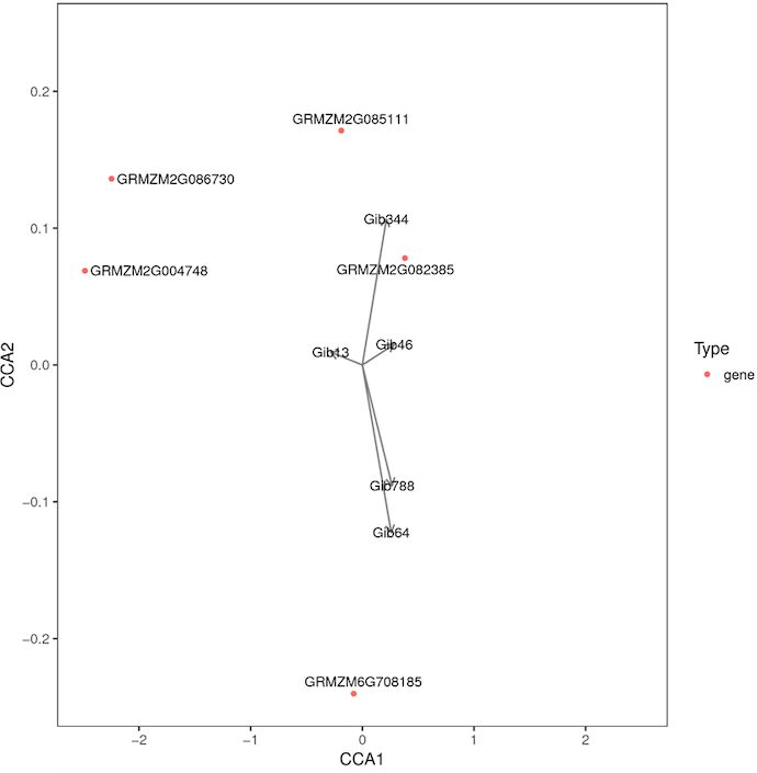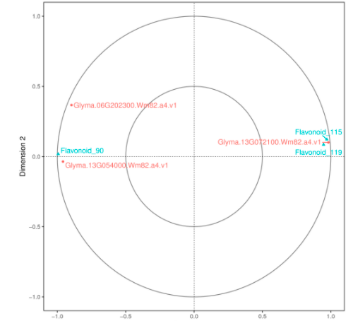 典型相關分析(canonical correlation analysis, CCA),是利用綜合變量對之間的相關關系來反映兩組指標之間的整體相關性的多元統(tǒng)計分析方法。對相關性網絡圖中的差異基因及差異代謝物進行典型相關分析,圖中以十字區(qū)分出四個區(qū)域,在同一個區(qū)域內,距原點越遠關聯性越高,在同一個象限內距離較近的代謝物和基因之間相關聯的程度高,基于此結果可進一步挖掘和代謝物最相關的基因。