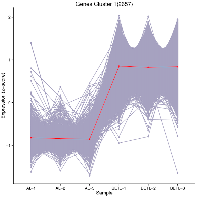 將各個分組對差異代謝物和差異基因分別用Kmeans進行分類,然后按分類進行繪圖,可找到變化趨勢一致代謝物和基因,這些趨勢一致代謝物和基因之間可能存在一定的關系,為研究提供了一定的方向。